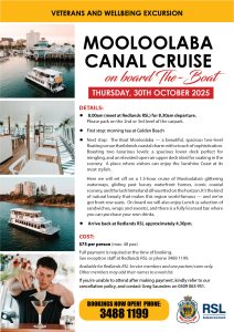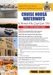 Cancellation Policy: If you’re unable to attend after making payment, please phone Greg Saunders on 0409 063 951. Cancellations will be reviewed on a case-by-case basis. Please note that short notice cancellations may not be eligible for a refund due to expenses incurred by Redlands RSL Sub Branch.